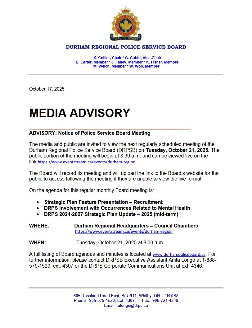 DRPS#1 Thursday, September 10, 2020 – ADVISORY: Notice of Police Service Board Meeting