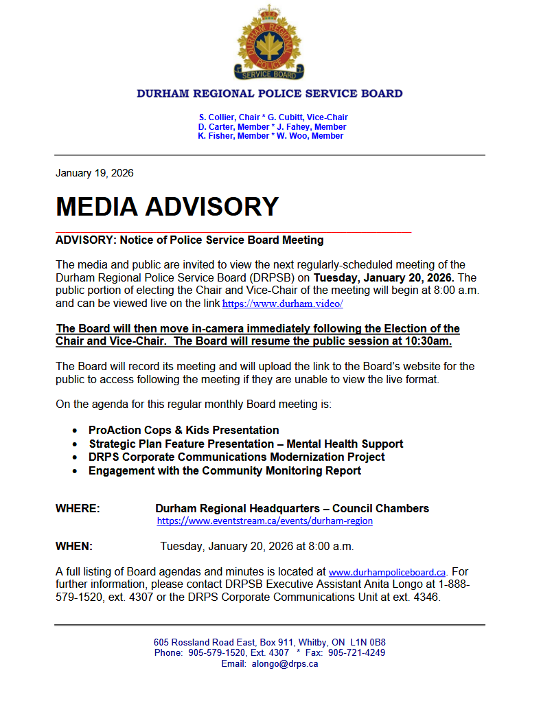 ADVISORY: Notice of Police Service Board Meeting (CANCELLED) Jan 12, 2022 ET